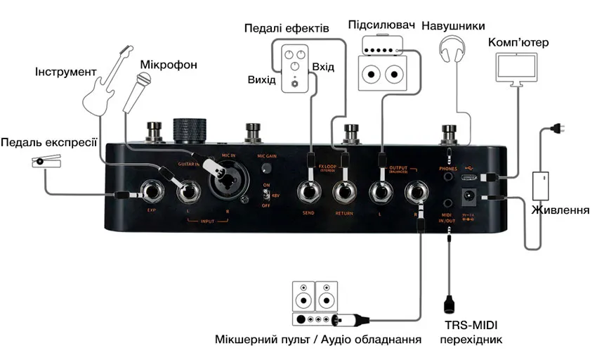 - 1/4" інструментальний вхід + XLR мікрофонний вхід (з фантомним живленням)