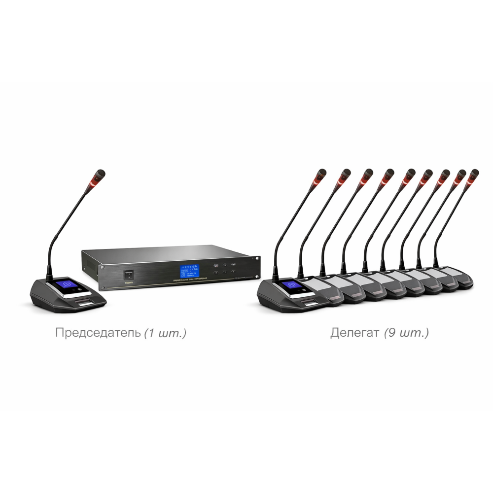 В комплект входит центральный процессор, один микрофон председателя и 9 микрофонов делегатов, что позволяет организовать эффективное обсуждение с возможностью контроля выступлений. Благодаря функции приоритета председателя ведущий может управлять ходом конференции, при необходимости отключая другие микрофоны.