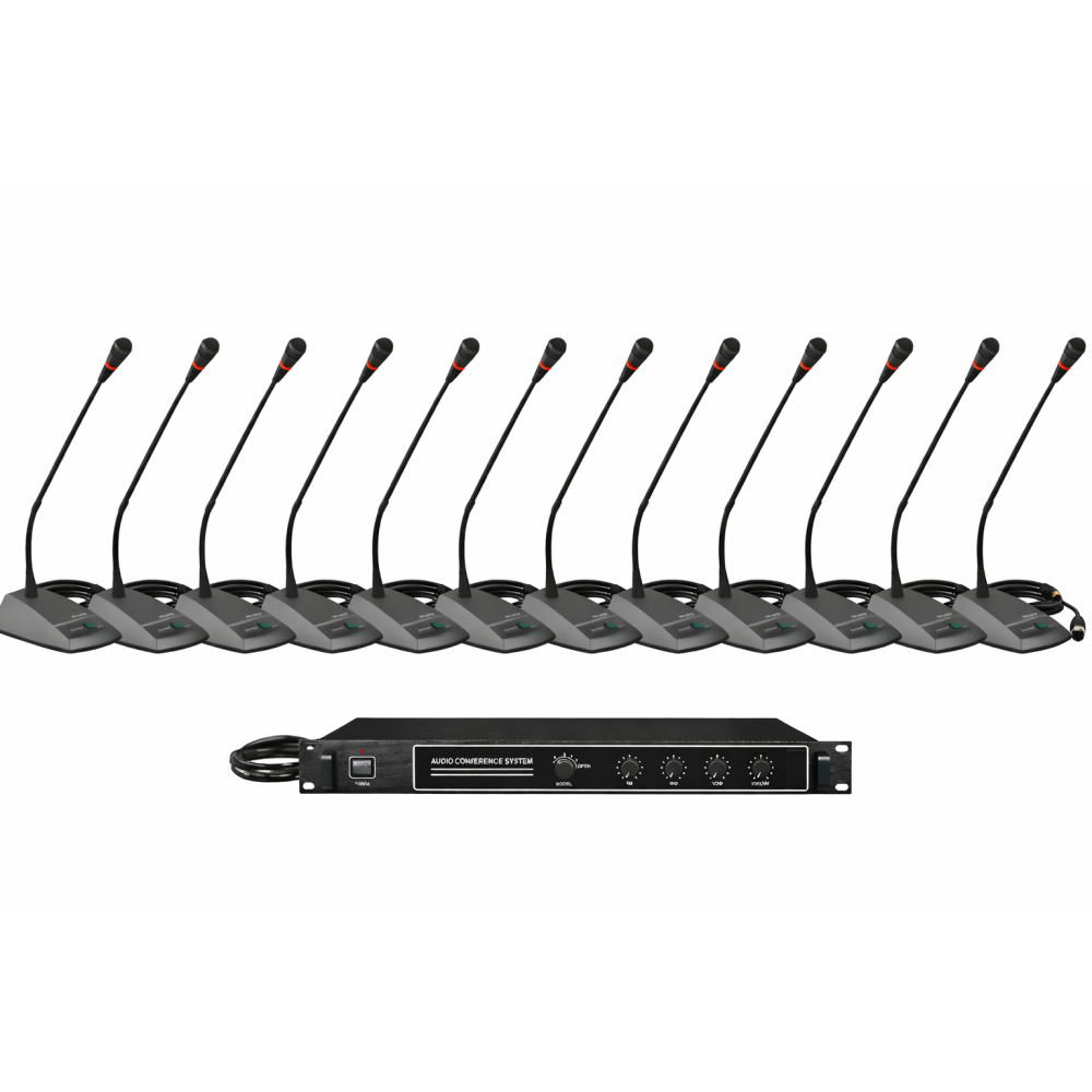 В состав входит центральный блок управления и 12 микрофонных станций (1 председателя и 11 делегатов), что позволяет эффективно организовать дискуссии с контролем приоритета. Микрофон председателя имеет функцию приоритетного отключения других участников, что особенно удобно для ведения собраний.