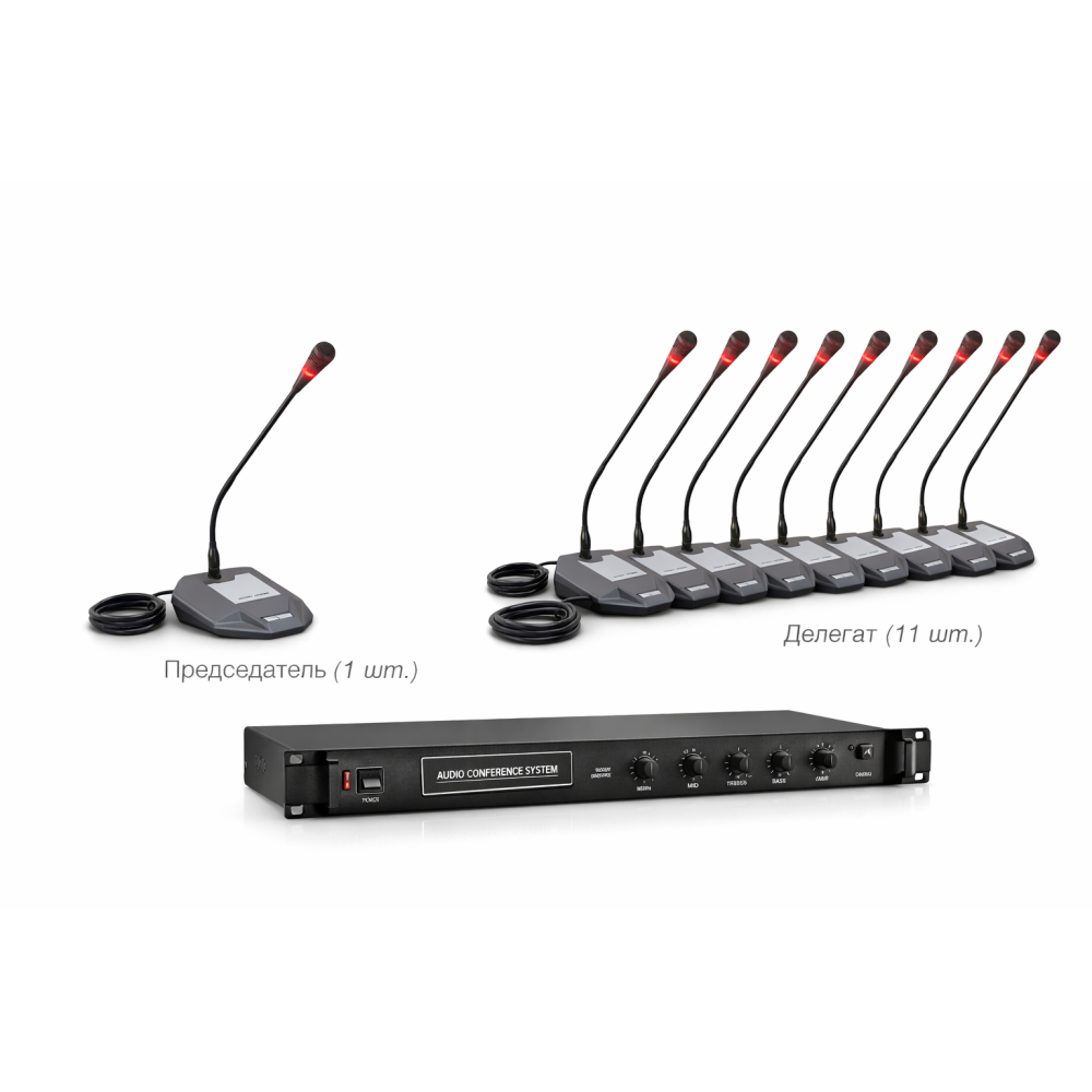 В комплект входит центральный процессор, микрофон председателя и 11 микрофонов делегатов, что делает систему оптимальной для рабочих групп и средних переговорных. Функция приоритета председателя позволяет эффективно контролировать ход обсуждения, при необходимости отключая микрофоны участников.