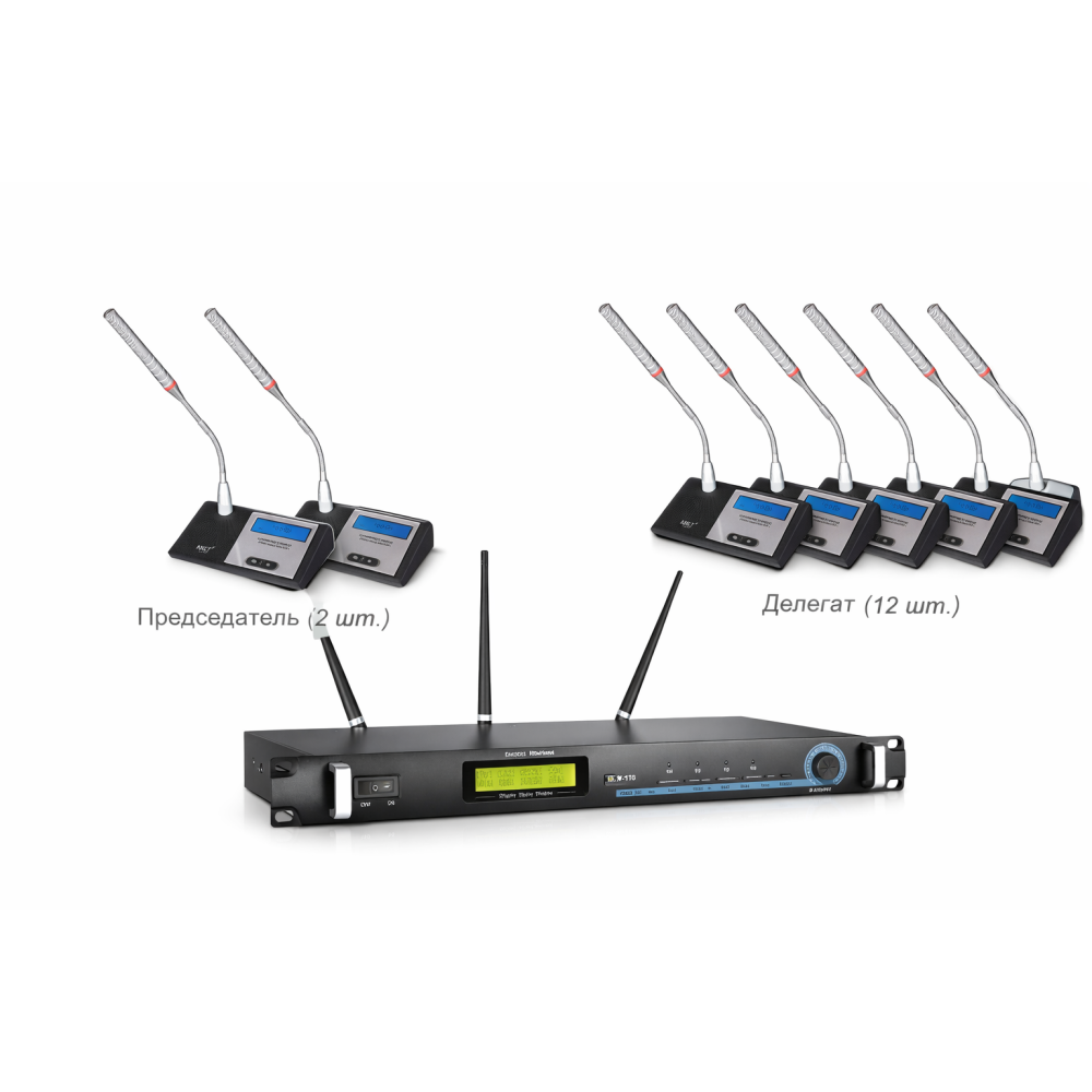 В комплект входит центральный процессор, 2 микрофона председателя и 12 микрофонов делегатов, позволяя организовать полноценную дискуссионную площадку с контролем выступлений. Благодаря беспроводной технологии система легко устанавливается и не требует прокладки кабелей, что значительно упрощает монтаж и эксплуатацию.