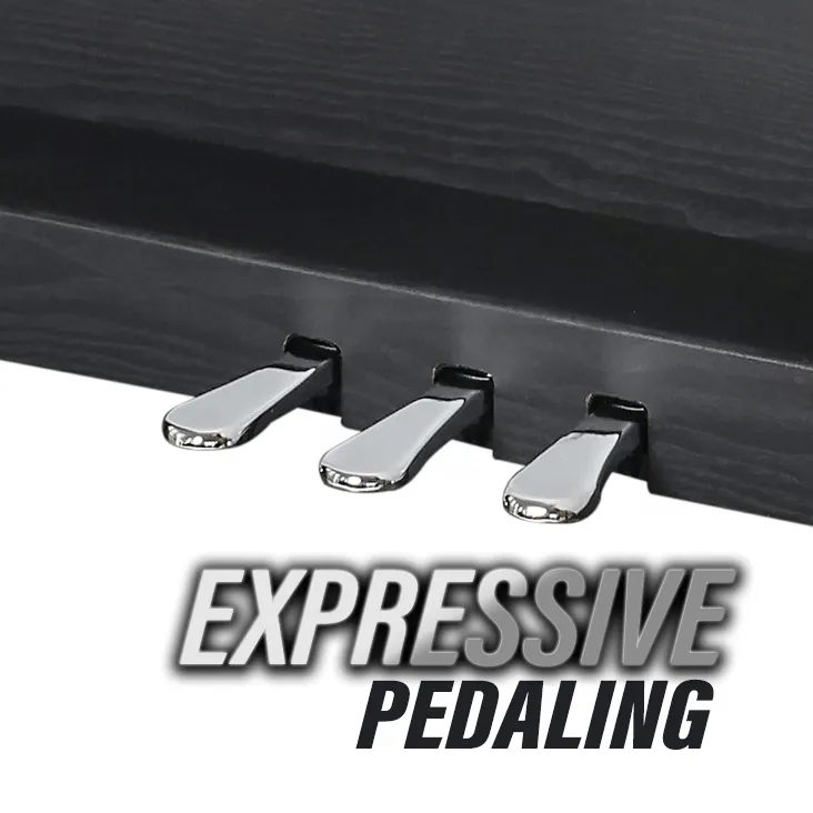 Педали Sustain, Sostenuto и Soft стандартны для фортепиано. Поддержка полудемпферного нажатия воспроизводит тонкие нюансы исполнения с большей динамической экспрессией.