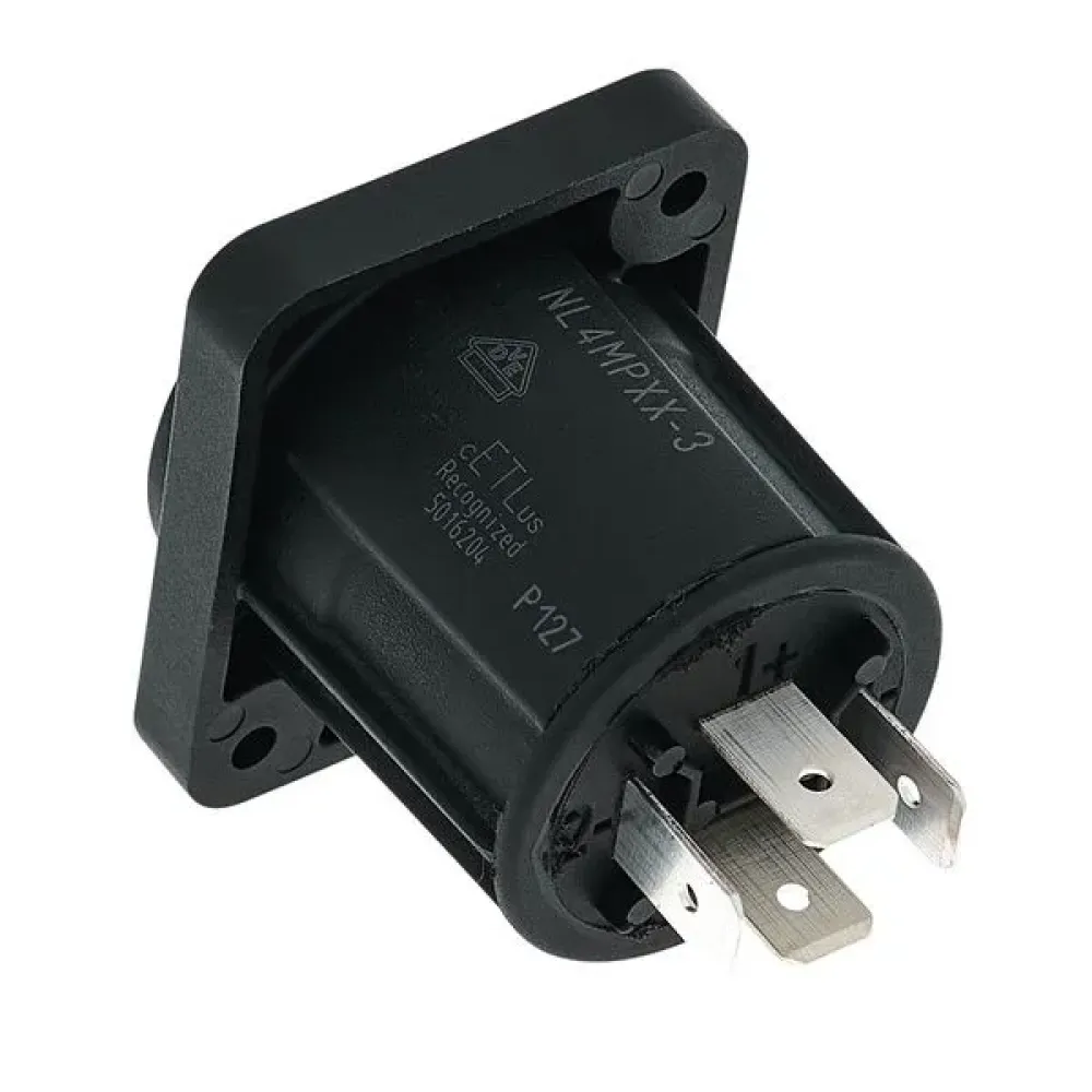 Neutrik NL4MPXX — это высококачественный панельный разъём SpeakON, предназначенный для подключения акустических систем и усилителей. Данный коннектор является 4‑контактным (4‑pole) и рассчитан на надёжное и долговечное соединение благодаря поворотному механизму фиксации (twist‑lock) с металлической вставкой, что гарантирует контакт только при полном закрытии фиксации.