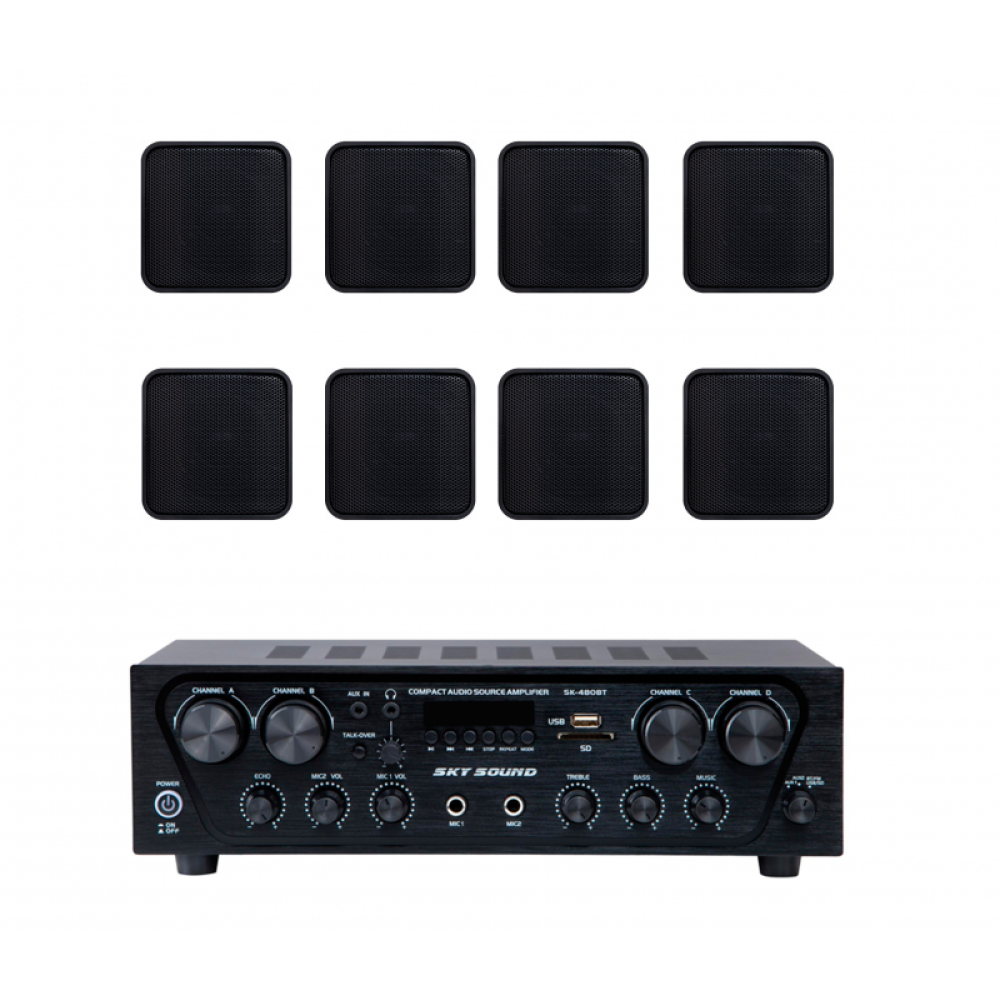 Акустический комплект Sky Sound SKW-4808VS Black состоит из 4 пар (8 шт.) настенных акустических колонок Sky Sound VS-6B/TB (Black) и одного многозонного усилителя мощности Sky Sound SK-480 (4*80W). Комплект системы озвучивания предназначен для фонового музыкально-речевого озвучивания в небольших помещениях: офисах, магазинах, кафе, салонах красоты, гостиничных номерах, коридорах, учебных классах и других объектах.
