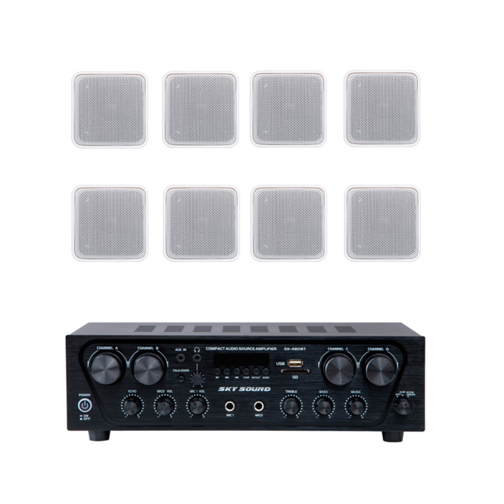 Акустический комплект Sky Sound SKW-4808VS WHITE состоит из 4 пар (8 шт.) настенных акустических колонок Sky Sound VS-6W/TW (White) и одного многозонного усилителя мощности Sky Sound SK-480 (4*80W). Комплект системы озвучивания предназначен для фонового музыкально-речевого озвучивания в небольших помещениях: офисах, магазинах, кафе, салонах красоты, гостиничных номерах, коридорах, учебных классах и других объектах.