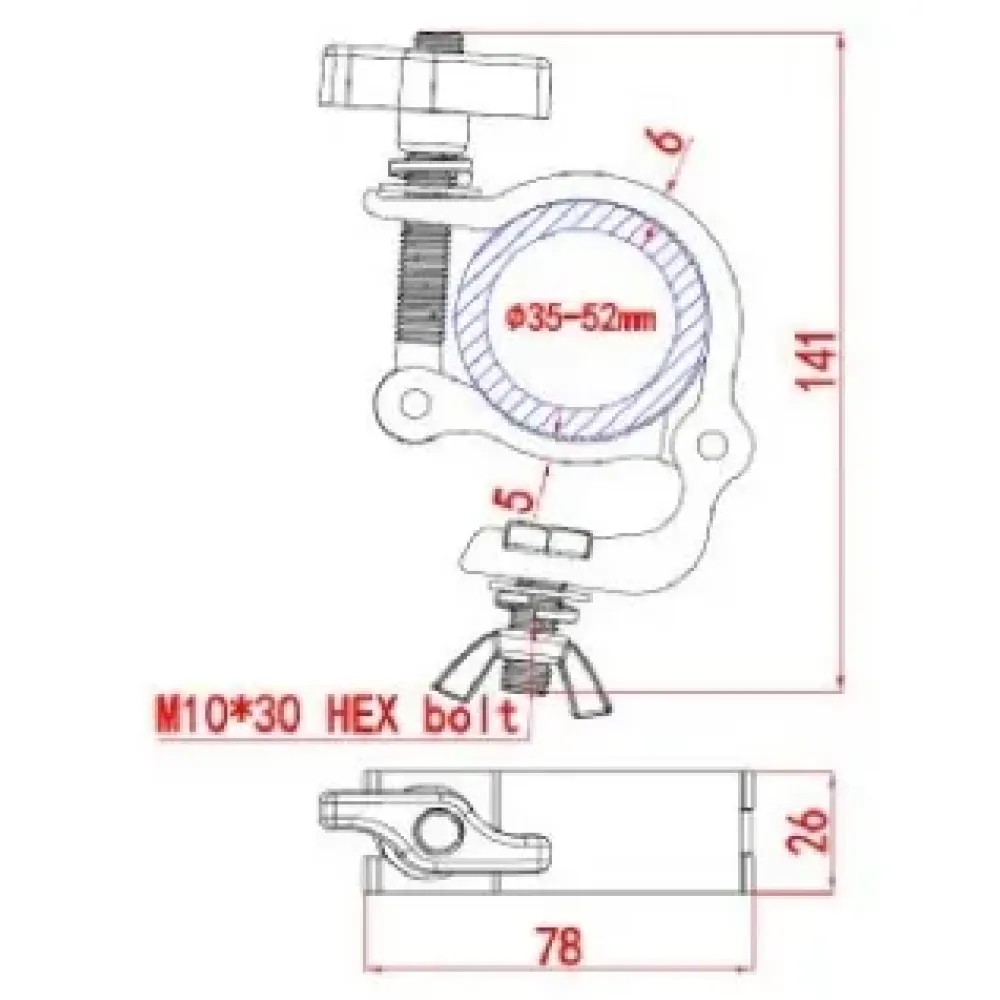 Струбцина - це професійний кріпильний затискач, створений для безпечного встановлення та фіксації світлового обладнання на тросах, фермах, стійках та інших конструкціях сцени. Виготовлена з якісного алюмінію, вона забезпечує надійне зчеплення та тривалий термін служби навіть за частої експлуатації.