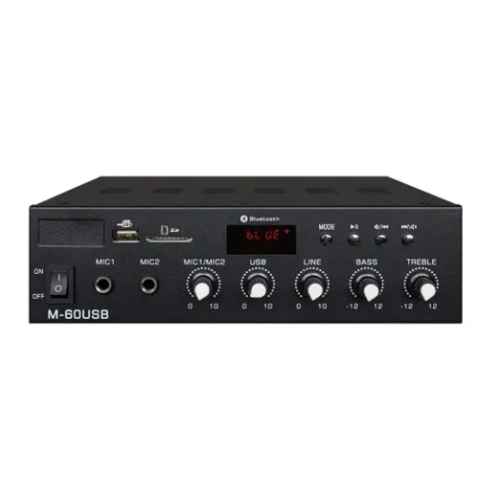 ProRecAudio M-60USB — компактний та функціональний трансляційний підсилювач, призначений для побудови 100-вольтових систем озвучування та оповіщення, а також для роботи зі звичайною акустикою 4–16 Ом. Модель ідеально підходить для магазинів, кафе, офісів, навчальних закладів та комерційних об'єктів, де потрібне просте управління та стабільна робота.
