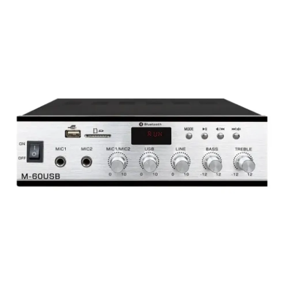 ProRecAudio M-60USBS — компактний та функціональний трансляційний підсилювач, призначений для побудови 100-вольтових систем озвучування та оповіщення, а також для роботи зі звичайною акустикою 4–16 Ом. Модель ідеально підходить для магазинів, кафе, офісів, навчальних закладів та комерційних об'єктів, де потрібне просте управління та стабільна робота.