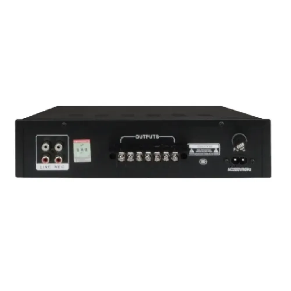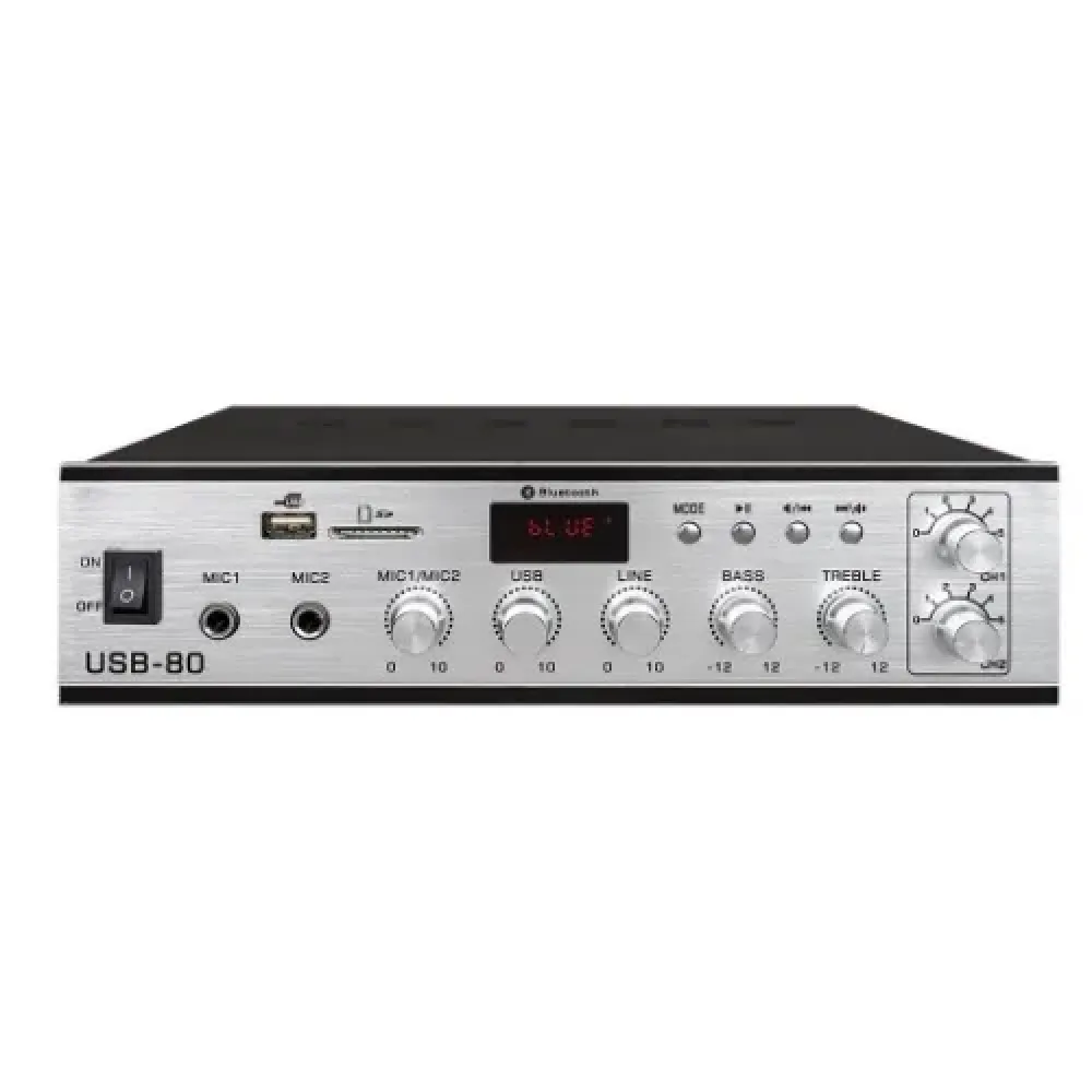 Вихідна потужність 80 Вт дозволяє впевнено озвучувати приміщення середньої та великої площі. Підсилювач підтримує 2 незалежні зони з роздільним регулюванням гучності, що зручно для магазинів, кафе, офісів та громадських просторів з різними рівнями шуму.